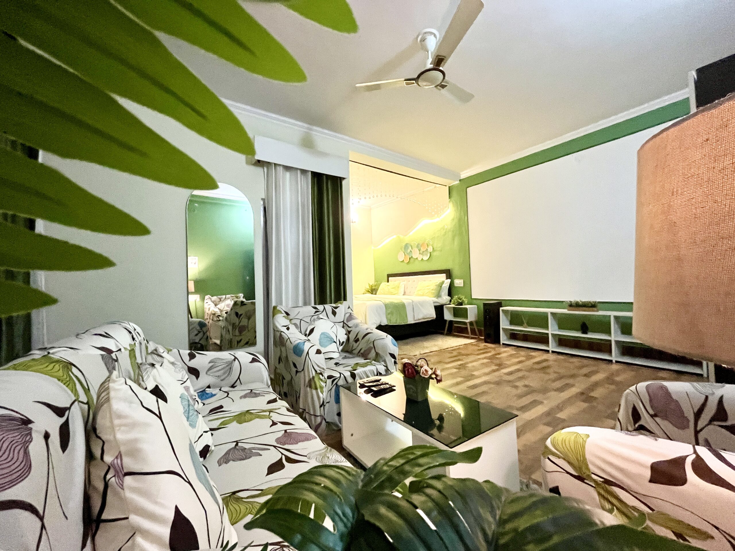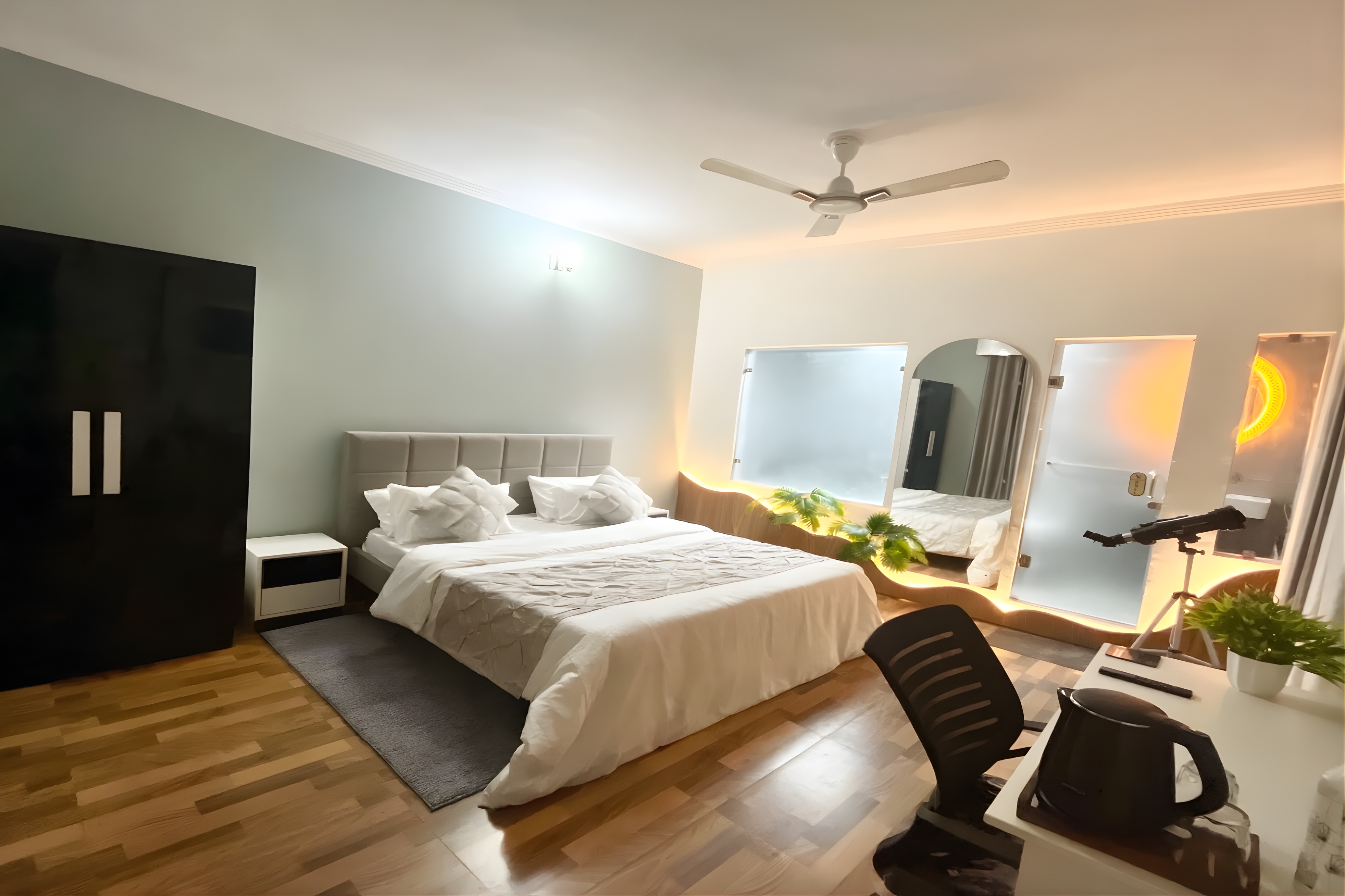 Spacious balcony with panoramic views Private theater room with premium speakers King-size bed Attached washroom with modern amenities High-speed Wi-Fi connectivity